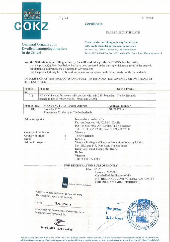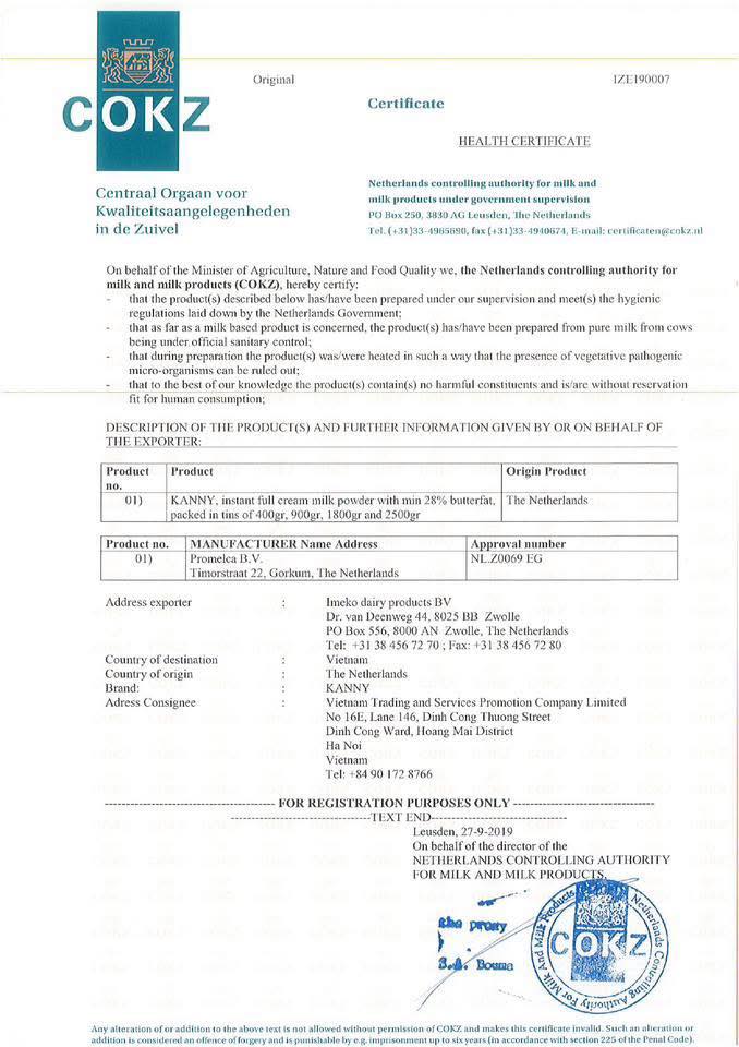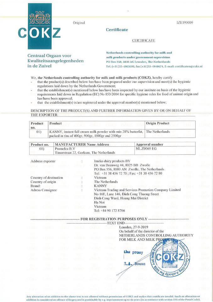 Sữa Kanny được đạt chứng nhận tiêu chuẩn ISO (International Organization for Standardization) – bộ tiêu chuẩn toàn cầu đánh giá sự ổn định, an toàn và chất lượng của sản phẩm. Đồng thời đạt chứng nhận FSSC 22000 tiêu chuẩn an toàn thực phẩm quốc tế, bao gồm quản lý vấn đề dị ứng – rất an toàn cho người sử dụng.