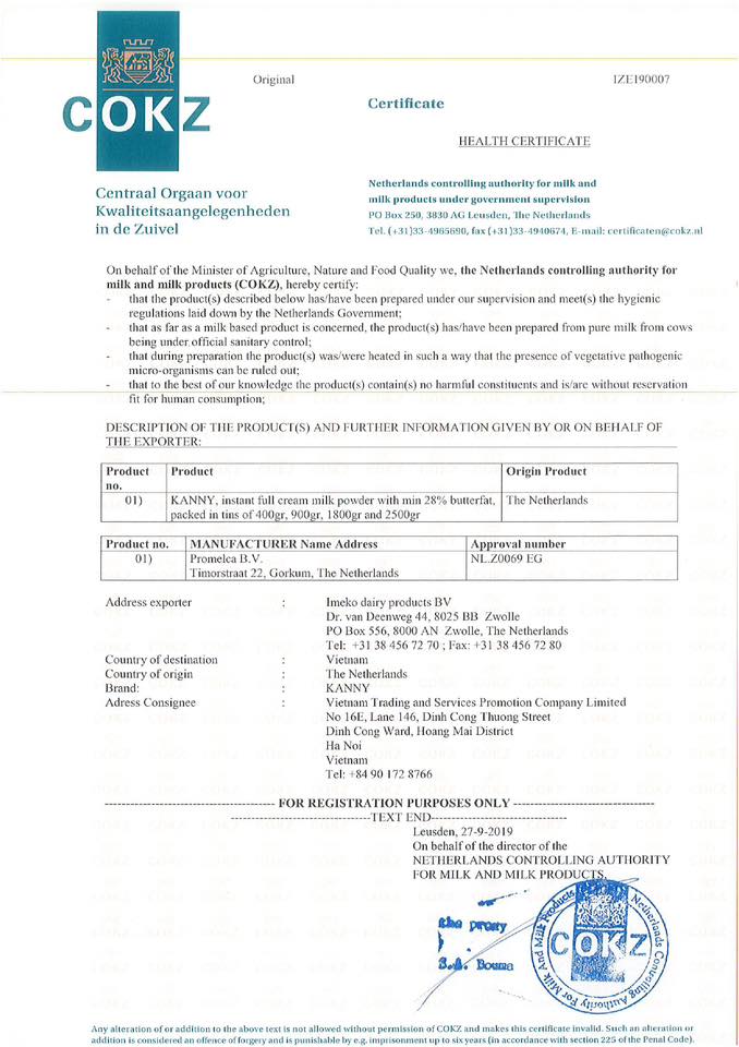 Tài liệu là giấy chứng nhận sức khỏe cho sản phẩm sữa bột nguyên kem Kanny, do COKZ (Cơ quan kiểm soát sữa và sản phẩm sữa Hà Lan) cấp.